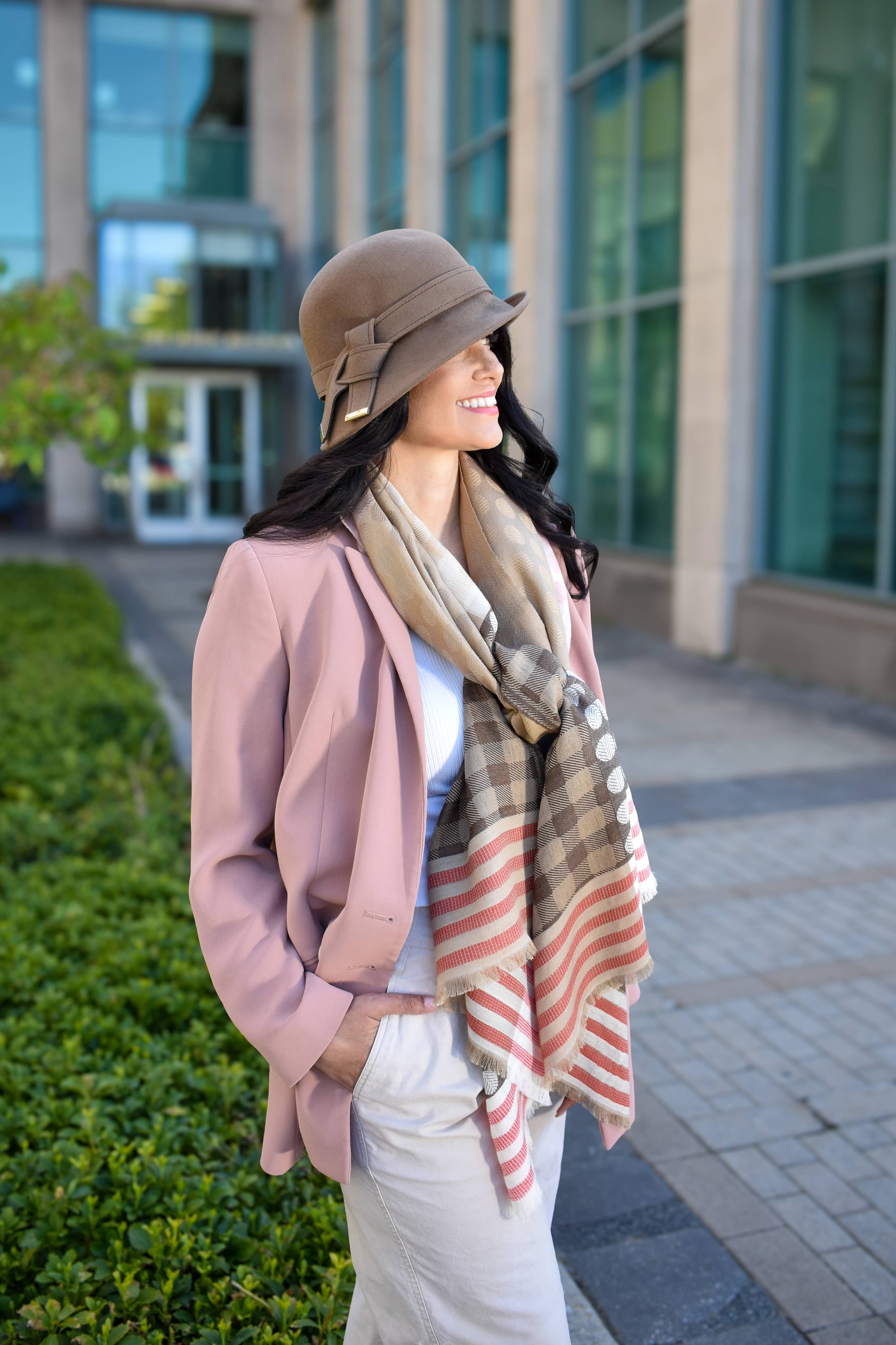 This asymmetrical wool bucket hat features a unique design that sets it apart. A wool band trim adorned with subtle metal accents adds a touch of sophistication. Each hat includes an adjustable tie inside the brim for a personalized fit. Formed hats also include a complimentary hat bag for convenient storage and travel. Perfect for elevating any outfit, this hat combines style and warmth, making it an essential accessory for cooler weather. Size: Women's O/S Fabric: 100% Wool Care: Spot Clean Season: Fall/Winter