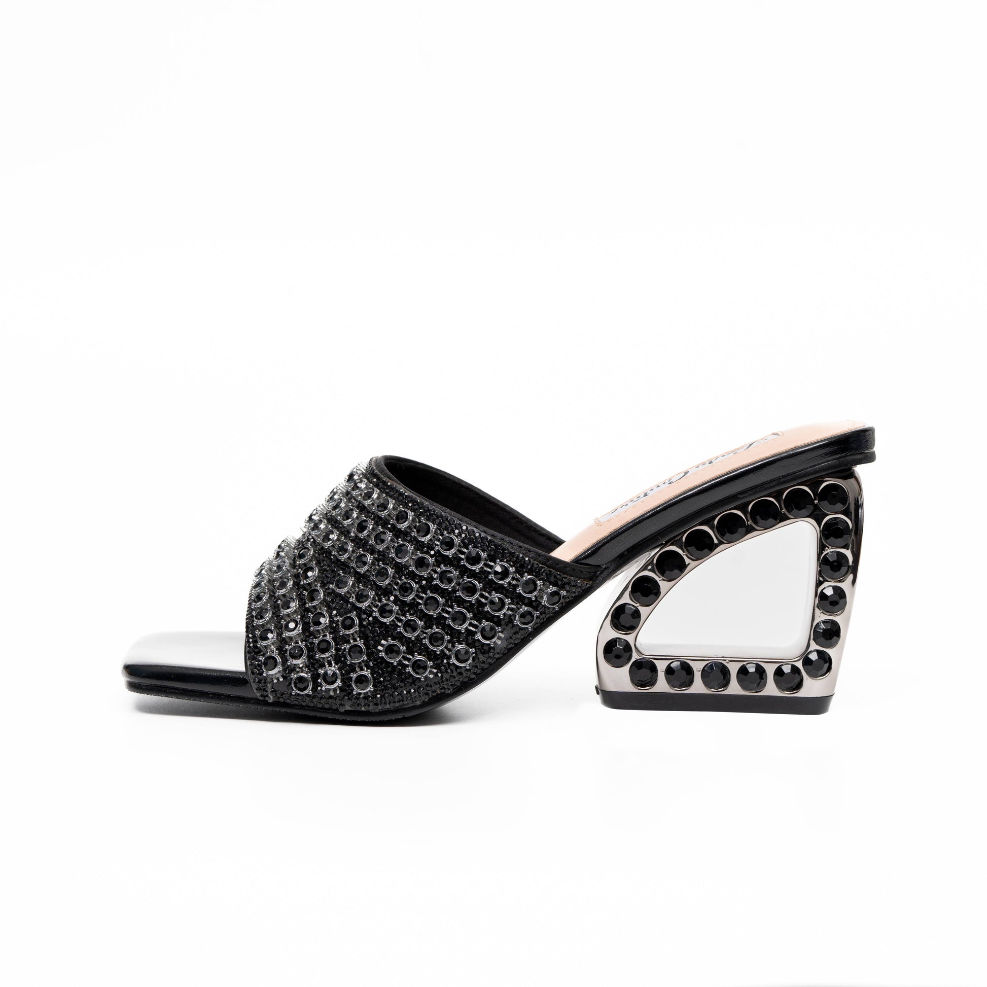 Step up your fashion game with these sophisticated mules showcasing a unique square toe and an eye-catching metallic jewel heel. Enhanced with crystal details, they add a subtle yet luxurious shimmer to your look. The open-toe style promotes airflow and comfort, perfect for summer wear. Heel measures 3 inches.