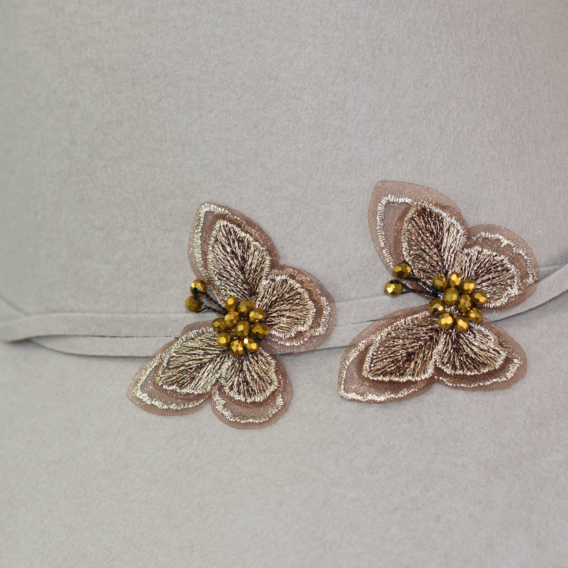 This beautifully structured asymmetrical hat balances bold lines with whimsical charm. Featuring a twisted wool band and a graceful butterfly appliqué, it's equal parts refined and romantic. An adjustable elastic tie under the sweatband ensures a snug fit, and it comes with a complimentary hat bag for stylish storage or travel-ready protection. Whether you're dressing up for a seasonal event or elevating your everyday, this statement piece is sure to turn heads. Fabric: 100% Wool Size: O/S Care: Spot Clean Only Season: Fall/Winter